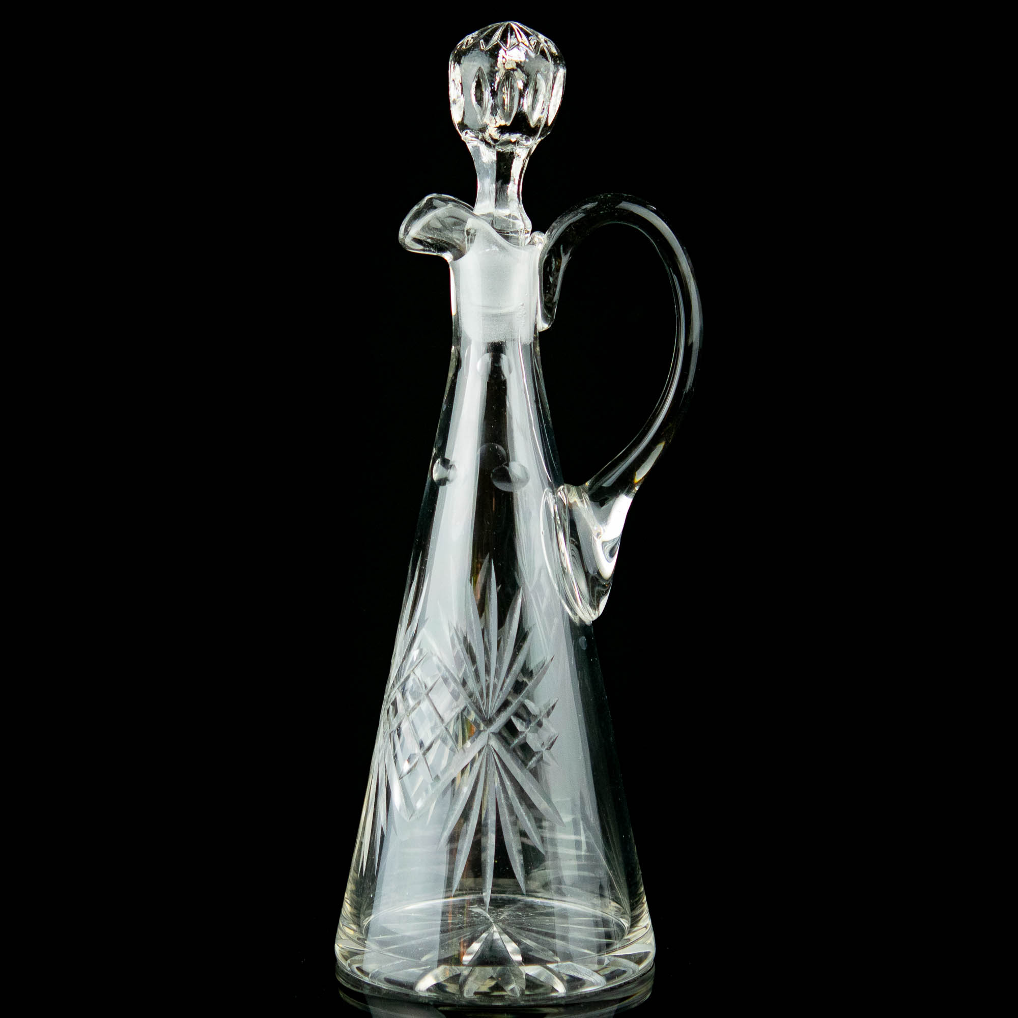 Klaasist lihvitut veinikarahvin sangaga