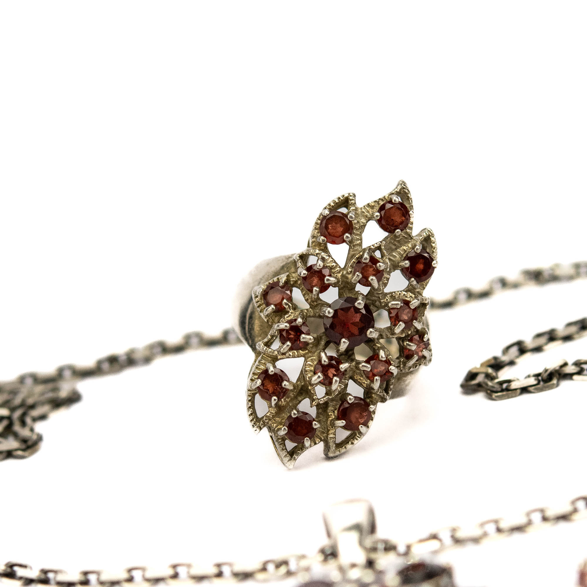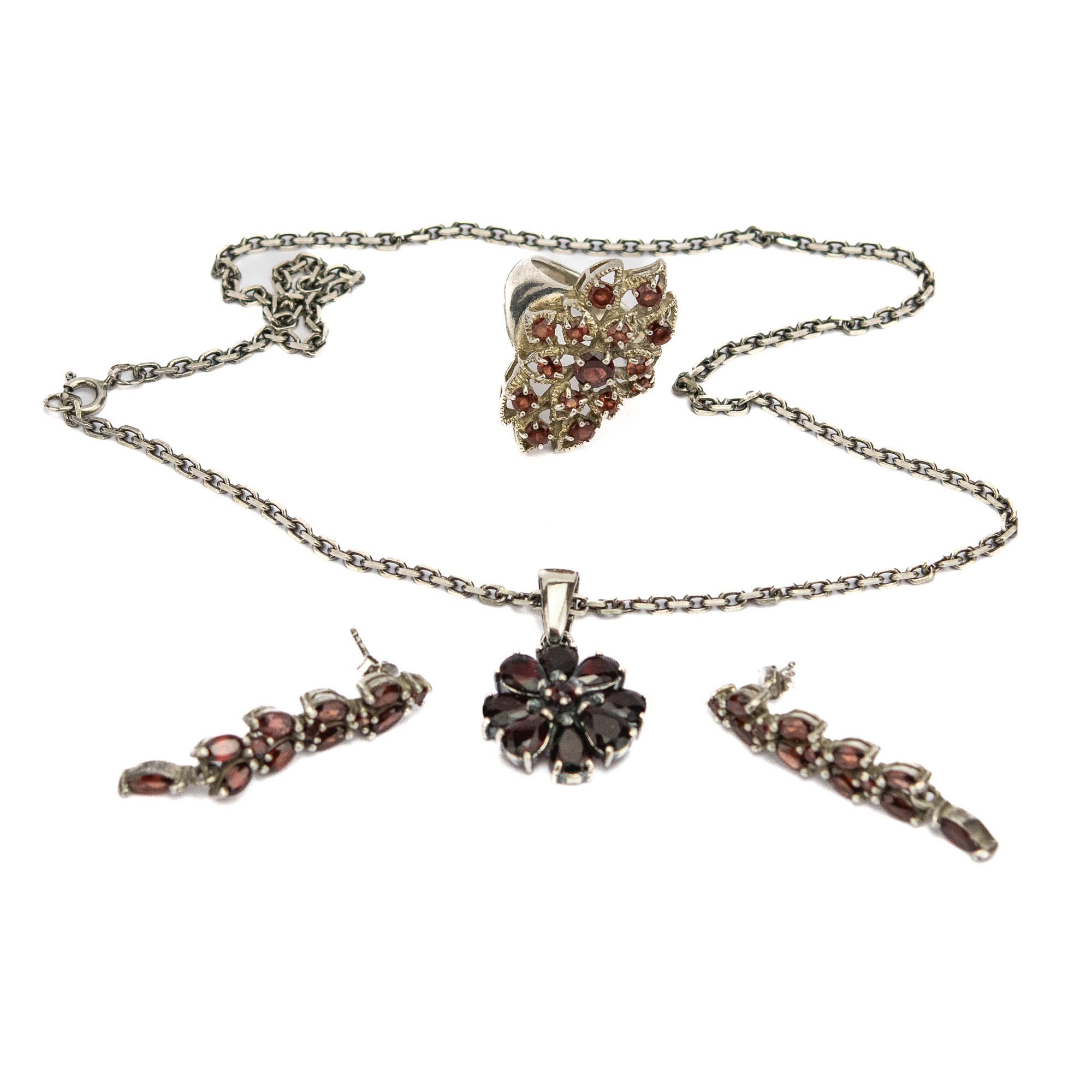 Komplekt sõrmus, kaelakee ja kõrvarõngad, 925 hõbe granaatidega