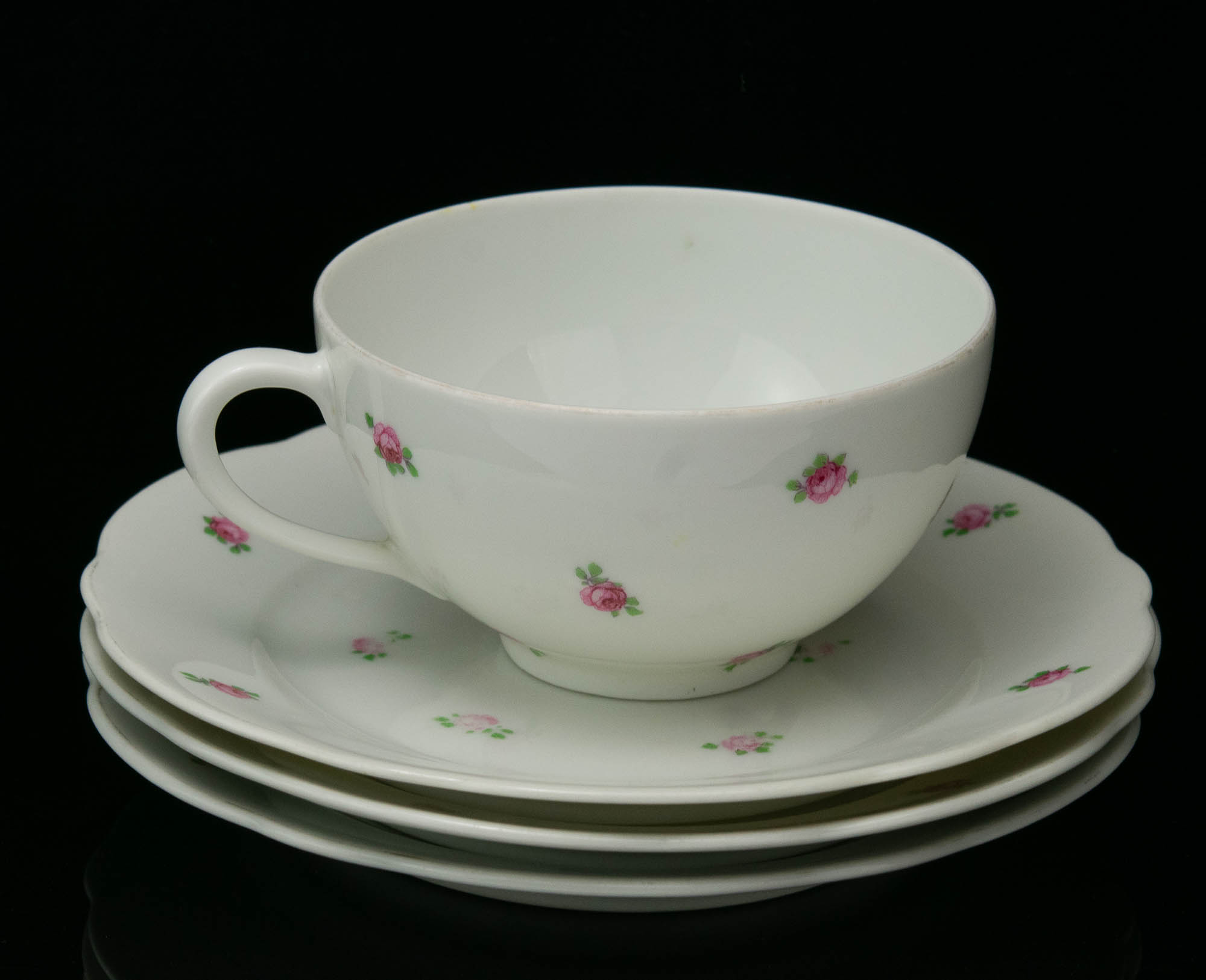 Langebrauni roosi dekooriga portselanist tass ja 3 koogitaldrikut